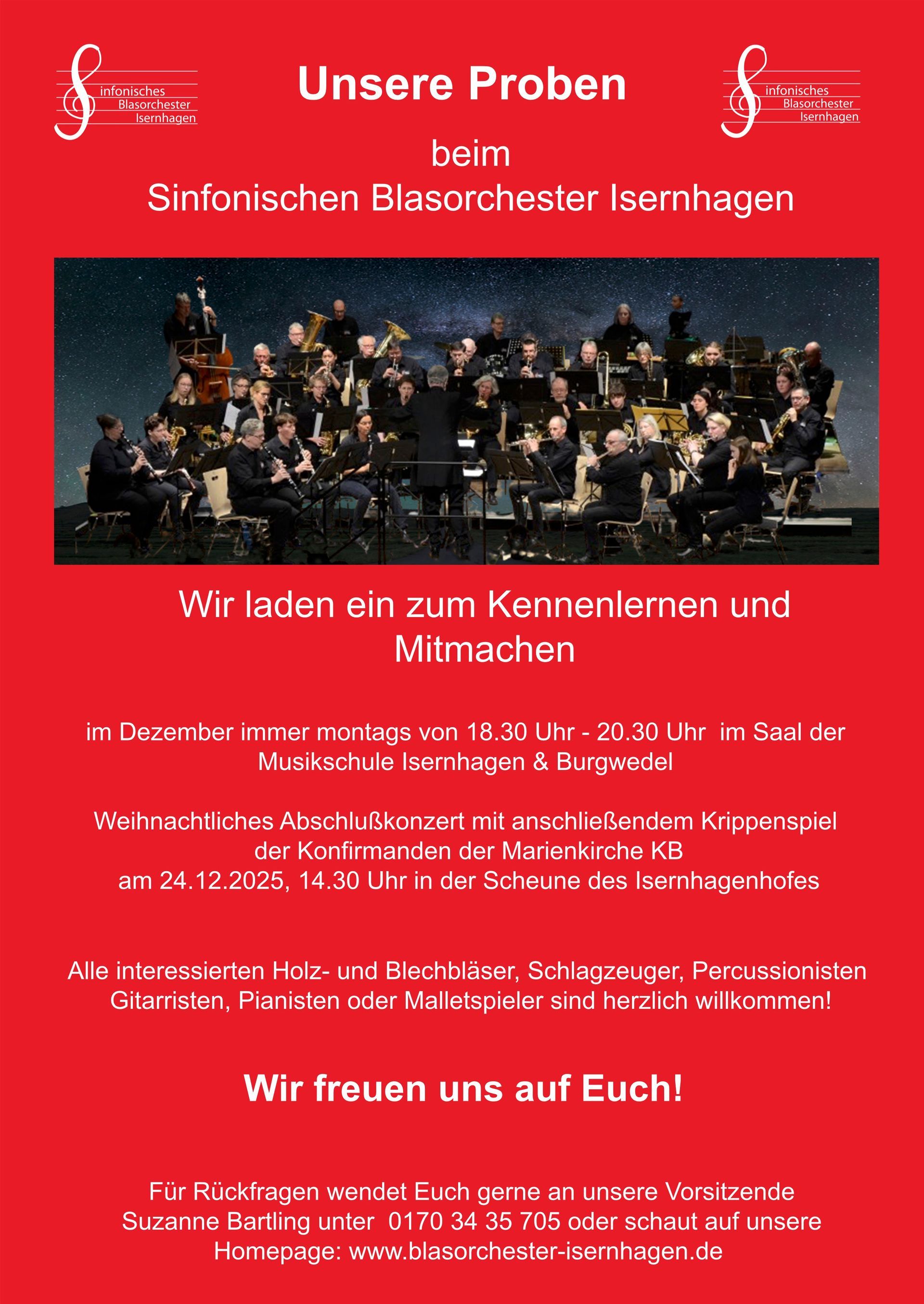 Das Sinfonische Blasorchester Isernhagen freut sich immer über neue MusikerInnen jeden Alters. Egal ob Blasinstrument oder Schlagwerk, Verstärkung in allen Registern ist erwünscht. Wir würden uns freuen, wenn Du Dir mal eine unserer Proben ansiehst oder besser gleich mitspielst und so unsere Probenarbeit und unsere MusikerInnen kennenlernst.